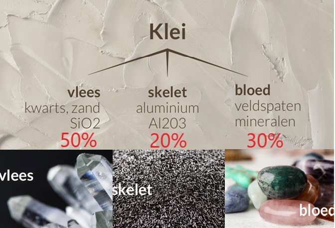 De overige 30% van klei is een samenstelling van alle andere mineralen, metalen en gesteenten. Boven de circa 700° graden gaan deze stoffen smelten, ieder met hun eigen smelttemperatuur. Een natuurkundig verschijnsel, het eutecticum, zorgt ervoor dat het gemiddelde van de som van al die verschillende smelttemperaturen, een aanzienlijk lager smeltpunt geeft dan het gemiddelde. Het bloed of smeltmiddel zorgt dat de kwarts zich aan het skelet, het aluminium hecht. Dat noemen we sinteren. Het gaat een moleculaire verbinding aan met het aluminium en silicium.