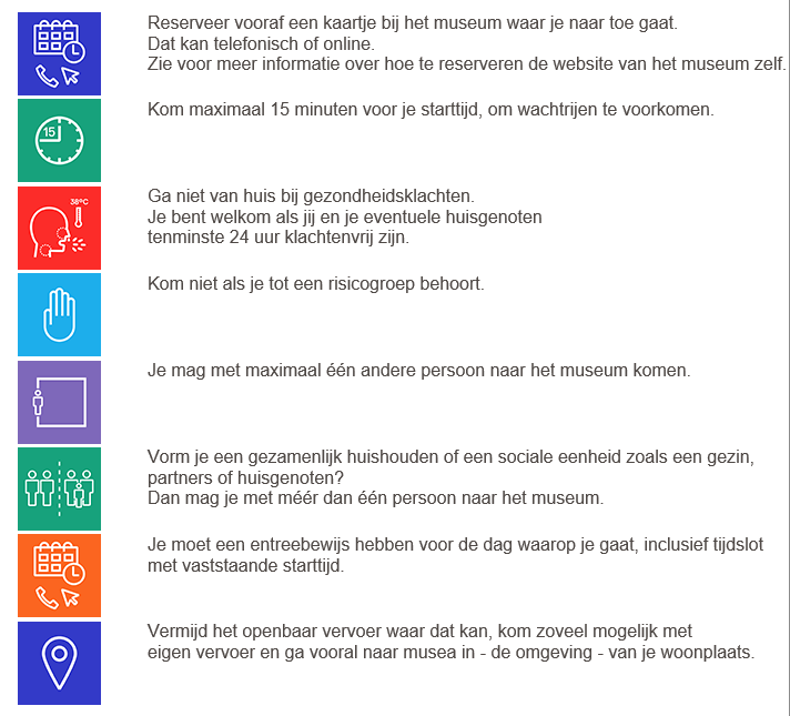 Musea hebben maatregelen getroffen om bezoek veilig en verantwoord te maken. Voor publiek betekent dat museumbezoek een beetje anders zal zijn dan voorheen. Zo is voorafgaand aan je bezoek een kaartje reserveren verplicht en moet je aangeven geen gezondheidsklachten te hebben. In de musea zelf zijn zichtbare instructies aangebracht die ervoor zorgen dat het afstand houden tot mede-bezoekers goed mogelijk is.