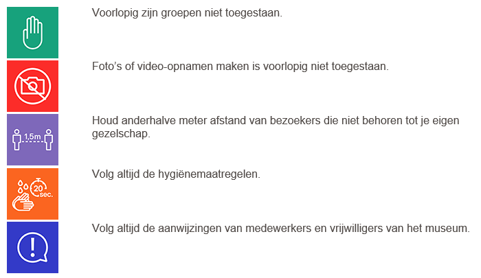 Ook in ons museum houden we ons strikt aan de regels, en we verwachten dat uiteraard ook van onze bezoekers. Dat betekent dat we soms bezoekers even moeten laten wachten. Of vragen even een stapje opzij te doen… Samen komen we er wel uit.