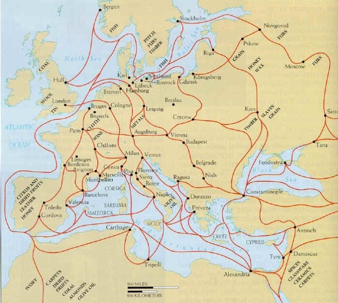 Tussen 1100 en 1500 was de handel tussen het Rijnland (glas, aardewerk, metalen) en Engeland (wol) in deze steden belangrijk. Brugge, het belangrijkste Hanzekantoor, had zeewaarts een verbinding met Londen met het Stalhof als hanzekantoor, maar ook de handel met het zuiden van Frankrijk (baaizout, wijn) en het Iberisch Schiereiland was belangrijk. Over land was er de verbinding met de handel van de Westfaalse en de Rijnlandse Hanzesteden en de Italiaanse steden (kruiden, zuidvruchten). Producten uit het verre Oosten zoals zijde uit India, porselein uit China, goud uit Afrika en Eurazië, kwam binnen in het handelscentrum Byzantium (Constantinopel). Vandaar vond het zijn weg niet alleen via de Middellandse Zeeroutes maar ook, via de grote Russische rivieren waarbij de daar inmiddels gesettelde Vikingen het tot richting de Oostzee transporteerden.
