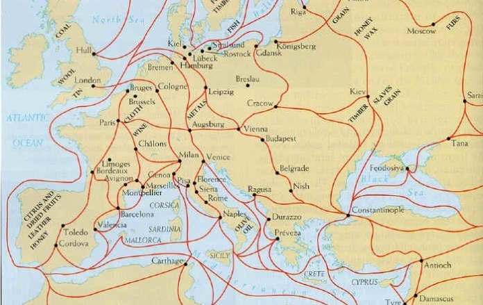 In de steden van Noord-West-Europa vormden middelgrote boeren en afgezanten van handelaren een klasse van kooplieden. Zij verenigden zich in Hanzen, voor het eerst in 1356 in de Duitse stad Lübeck. Een Hanze was een gezelschap, gemeenschap of (bewapende) schare van handelslieden, die elkaar beschermden tegen rovers en samenwerkten op economisch gebied. Het doel was elkaar te informeren over veilige handelsroutes, het vaststellen van richtprijzen en afspraken maken om gezamenlijk privileges te kunnen afdwingen, zoals vrijstelling van tol. Zo stimuleerden zij de onderlinge handel en winst. Op het hoogtepunt van de Hanze, begin 15e eeuw, waren er ongeveer 200 Hanzesteden. Deze Hanzen werden steeds machtiger, waaronder die van Londen, Italië en van de Oostzee.