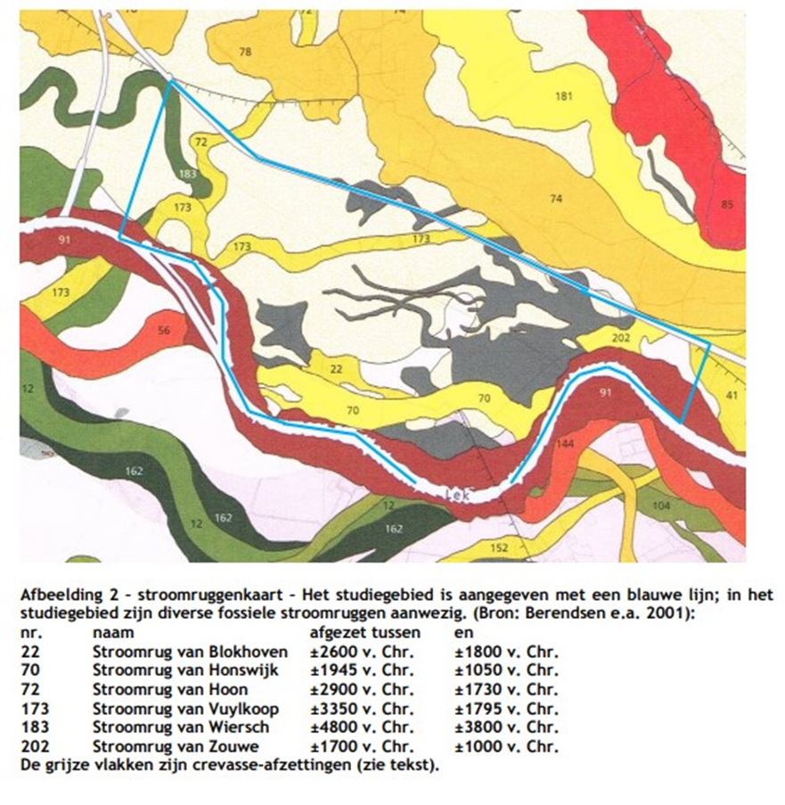 De rivierbeddingen met bijbehorende oeverwallen en kronkelwaarden vormen samen stroomruggen die hoger liggen dan het omliggende terrein. Het zijn voornamelijk deze door een goede afwatering vruchtbare stroomruggen die geschikt waren voor bewoning in het laagland waar men nog niet door dijken beschermd werd.”