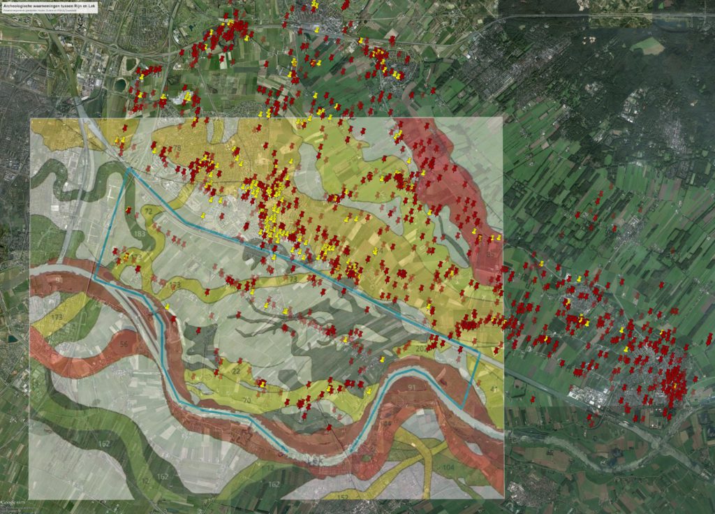 De gele markers geven de waarnemingen van onze werkgroep aan, terwijl de overige rode markers de waarnemingen van andere instanties – doorgaans commerciële archeologische bedrijven – aangeven. De kaart laat zien dat onze werkgroep een substantieel aandeel levert in het archeologisch onderzoek van de Kromme Rijnstreek! (Bron van de kaart: Archis). Zelf even op zoek gaan om te kijken of er vlak bij u in de buurt wat is gevonden? Klik hier!