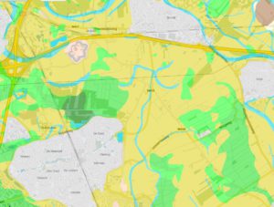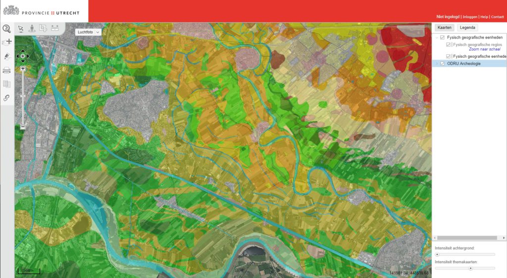 Ook leuk: een luchtfoto, met daar over heen de archeologische waardenkaart, en daar weer overheen de geomorfologische kaart. Hierbij het resultaat van het Kromme Rijngebied.