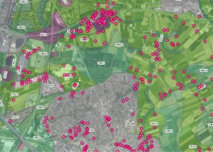 De vondsten uit de Romeinse Tijd, vanuit ARCHIS III: Op de luchtfoto is de geomorfologische kaart geprojecteerd, met daar overheen de vondsten en waarnemingen uit de Romeinse tijd.