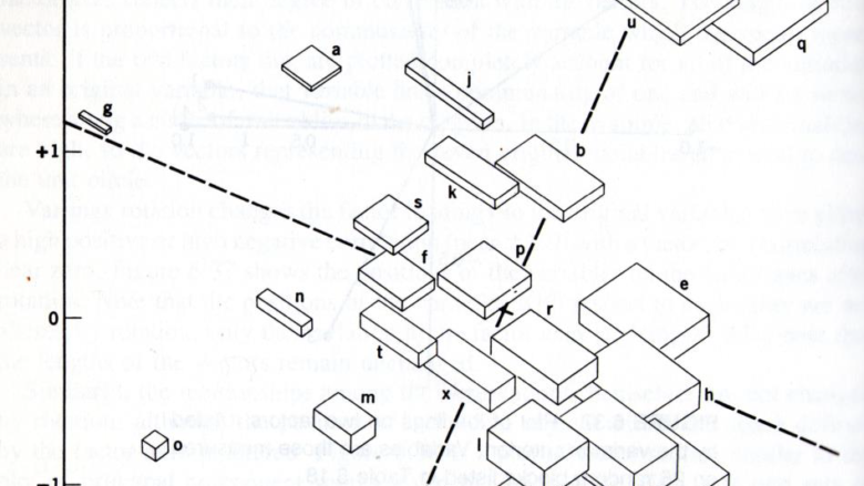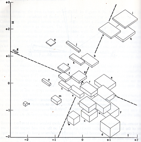 Hier komt de boer op de proppen! (Klik hier voor het verhaal over de boer!) Hij heeft nu begrepen dat het er om gaat een optimale positie in te nemen ten opzichte van wat je wilt ordenen. In een driedimensionale wereld is de positie van de boer eenvoudig voor te stellen. Met twee dimensies was het al knap lastig, maar met de blokjes wordt het langzamerhand toch net iets ingewikkelder. Zeven dimensies kunnen we ons niet meer voorstellen. Wat zou er bijvoorbeeld gebeuren als we ook nog eens de kleur van het blokje toevoegen, of het gewicht, enfin. Het besef dringt door dat we een list moeten verzinnen om die blokjes goed te ordenen.