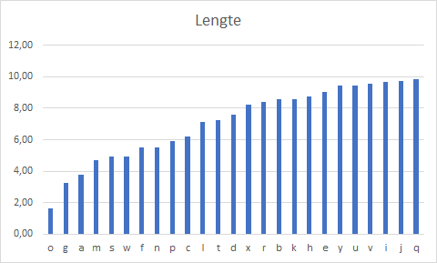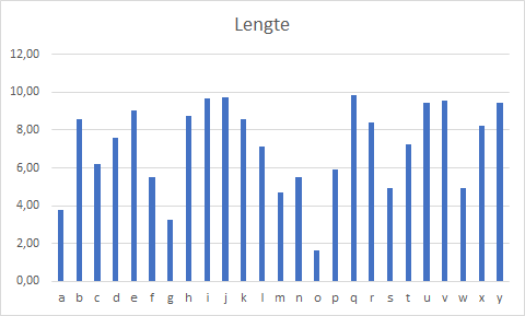 Stel je voor dat we een stel lengtes hebben, laten we zeggen 25 lengtes, en die lengtes zijn volkomen willekeurig. Om de lengtes uit elkaar te kunnen houden plakken we er een labeltje op, in dit geval de letters a tot en met y.