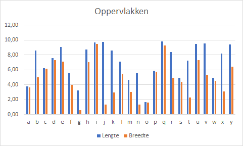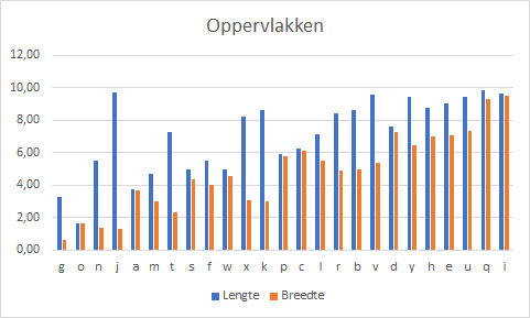 Nou, dan krijgen we wel de vorm van het oppervlak, van bijna vierkant ( Lengte/Breedte bijna 1 tot en met een zeer langwerpig oppervlak (Lengte/Breedte bijna 7,5). Maar als we die volgorde aanhouden, zien we dat de grootte van die oppervlakken totaal door elkaar lopen…