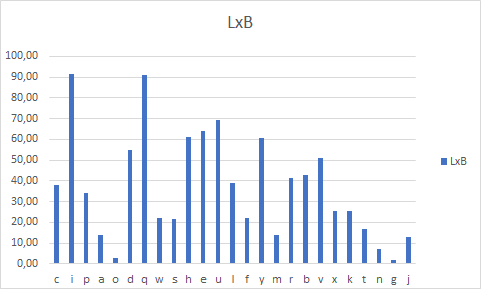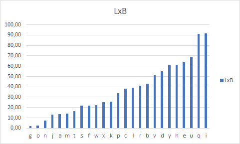👨🎓 Merk op dat we nu dus op een andere manier naar de oppervlakken kijken: niet in termen van lengte en breedte, maar langs andere assen, te weten LxB en L/B. Kortom, we hebben een andere positie ingenomen ten opzichte van de dimensies van de ‘objecten’, de oppervlakken (a) t.m. (y).