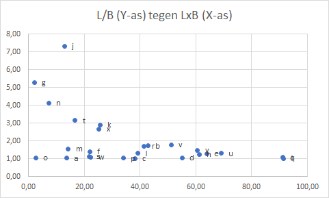 Op de verticale as, de Y-as zien we de vorm van vierkant (L/B=1) tot zeer langwerpig (L/B=8). Op de horizontale as, de X-as zien we de grootte van het oppervlak. We hebben nu dus de vorm tegen de grootte uitgezet. 🤔Dit geeft ons het beste overzicht wat we kunnen verzinnen op dit moment.