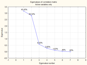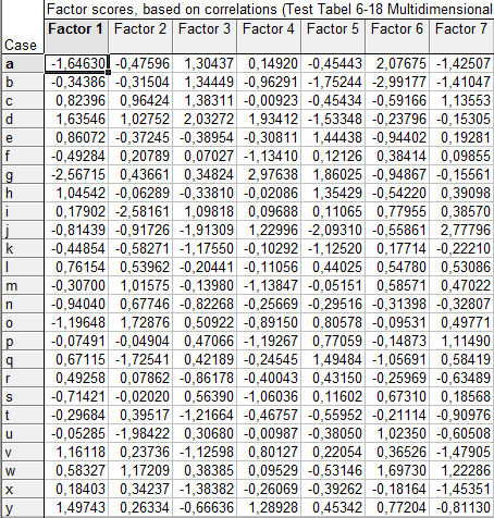 We kijken dus met een frisse hernieuwde blik naar onze gegevens, langs nieuwe zicht-assen. Dat zijn de ‘factoren’ die de belangrijkste informatie bevatten omtrent de verschillen tussen de objecten. Zo’n factor is dus op te vatten als een (specifieke) combinatie van de originele eigenschappen.