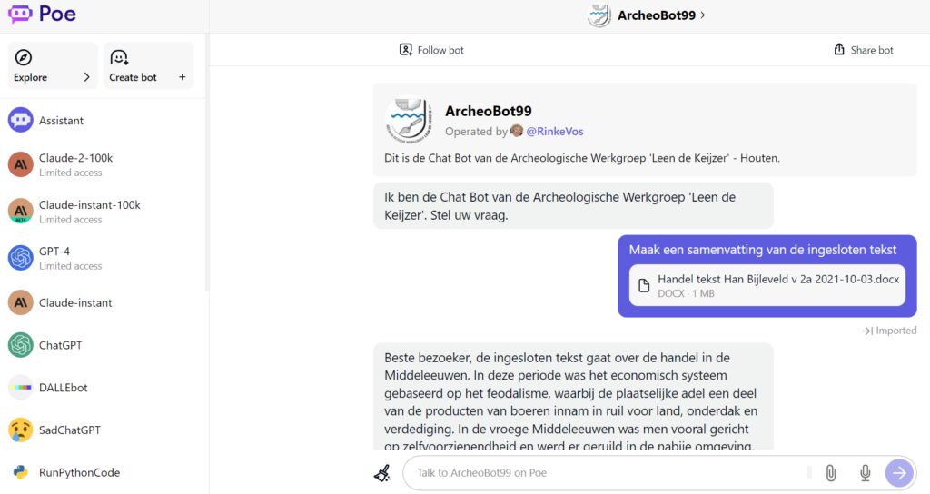 Beste bezoeker, recent hebben we onze ChatBot in het leven geroepen. We hebben onze ChatBot “ArcheoBot99” genoemd. Het is een proef om uw vragen sneller te kunnen beantwoorden. Wel is het zo dat onze Bot zich wel eens vergist. U kunt gewoon praten met de chatbot, net zoals u bijvoorbeeld tegen uw buurman aan zou kletsen. Dus aarzel ook niet om onze ChatBot op fouten te wijzen, en u kunt de ChatBot ook allerlei opdrachten geven, zoals bijvoorbeeld een samenvatting te maken van een tekst die u aanbiedt. Enfin, vooral vragen stellen, en als er opmerkingen zijn over de ChatBot zelf, dan graag een e-mail naar info@archeologiehouten.nl